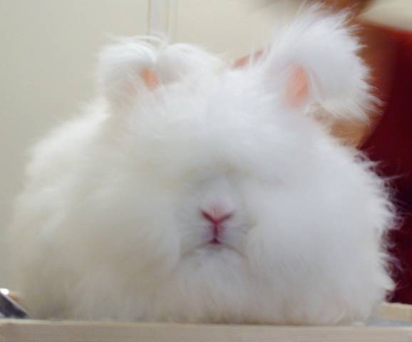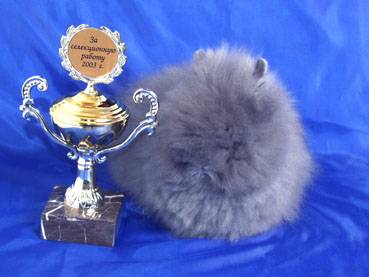 Great attention is also paid to the quality of the wool. It should be thicker than that of the industrial angora, but at the same time remain fluff, without passing into the guard hair, in order to preserve the appearance of the rabbit, as in the photo above. It is possible to increase the amount of awn, which will not allow the fluff to fall off and will make it easier for owners to care for the rabbit at home. Here the breeders themselves have not yet decided in which direction to move.
