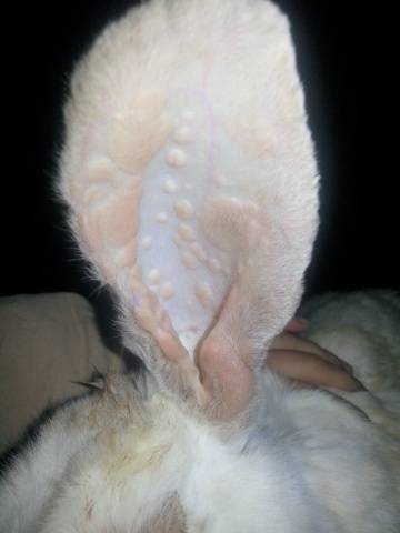With a nodular form of the disease, hard reddened bumps appear on the rabbit's body. Owners usually notice these masses on the ears, as there is no thick hair on the ears and the nodules are clearly visible.