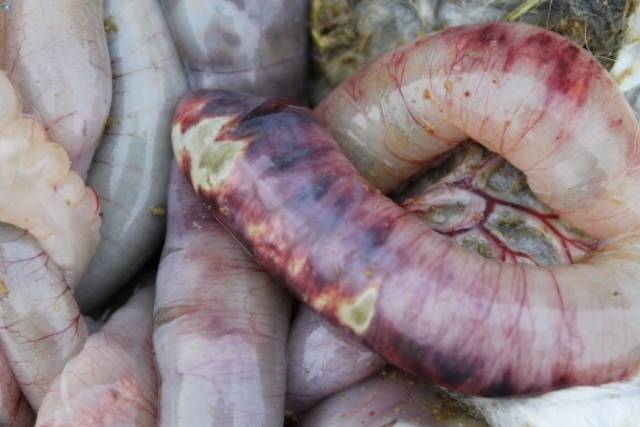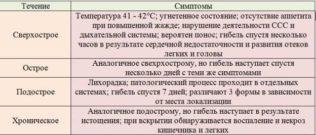 - in the intestinal form of the disease, the symptoms are dark diarrhea mixed with blood, lack of appetite, thirst;