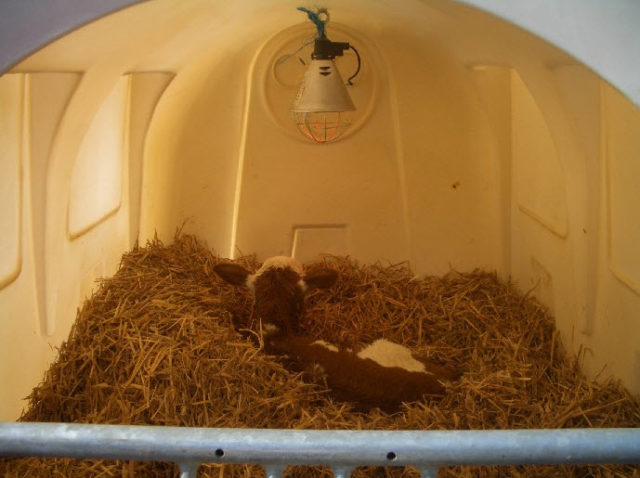 A thick layer of straw is laid on the floor of the boxes to protect the calves from the cold. It is advisable to use the lamps within the first hours after birth, until the coat is dry.