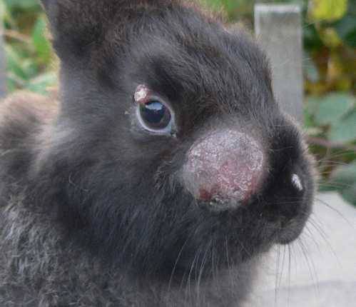 Myxomatosis begins with inflammation of the eyes, they begin to watery. Animals suffer from conjunctivitis and blepharitis, a dry crust forms around the eyes. It is difficult for animals to rotate their heads, since any movement causes pain. Later, myxomatosis passes to the nose, as evidenced by a runny nose, which makes breathing difficult. The rabbits begin to wheeze.
