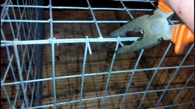 - The assembly of the structure begins from the side walls. The mesh is connected with pieces of galvanized wire. For this, the staples are bent with pliers. The process of connecting the mesh is shown in the photo.