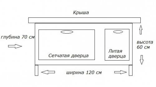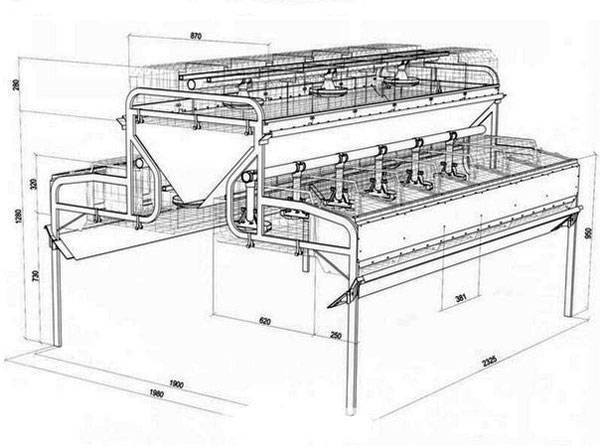When drawing up a diagram of a mesh cage, it is necessary to provide a stand, the location of the door, drinkers, grain feeders and herbs. In the photo you can see a drawing of a frameless structure on a stand with dimensions.