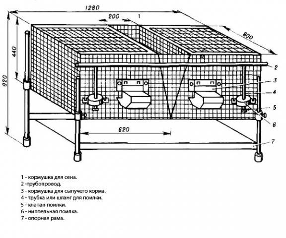 Having decided on the place of keeping the rabbits and the design of the house, it is necessary to draw up drawings. But first you need to calculate the size of the cage. Young animals for slaughter are kept in groups of 6–8 heads. Sometimes farmers increase the number of rabbits up to 10 individuals. One such animal is allocated 0.12 m² of free space. The young animals left for the tribe are kept by 4–8 individuals, giving them 0.17 m² of free space.