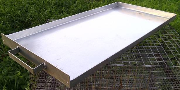 - The pallet is made of galvanized sheet steel. The workpiece is cut out 2 cm more on each side than the dimensions of the bottom of the structure. The stock is needed for the sides. Galvanized edges are bent at an angle of 90about... If the height of the sides does not allow the pallet to freely enter into the gap left near the floor, they are slightly trimmed. The edges of the galvanized steel must be deburred.