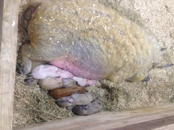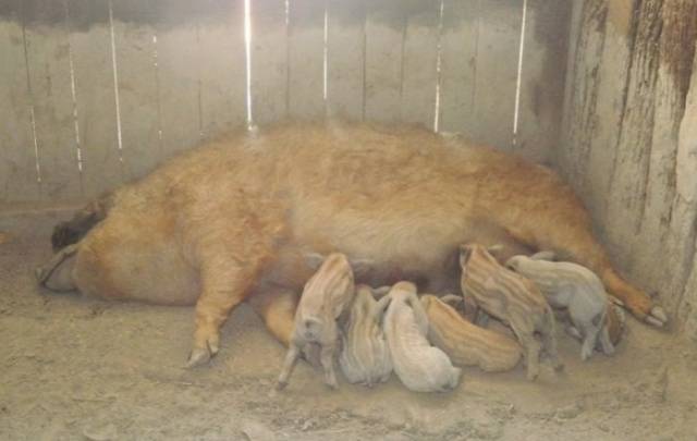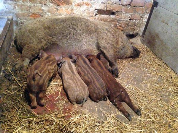 Piglets are born very quickly and immediately go to the teats. In the descriptions of the breed, piglets of the Hungarian mangalitsa are advised to cut the umbilical cords and disinfect the cut with iodine to avoid umbilical infection.