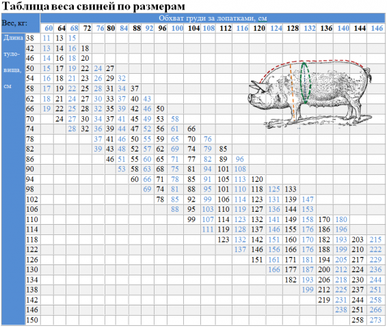 By six months, the piglets reach a weight of 70 kg. The layer of fat to the age of slaughter reaches 5.5-6.5 cm. To clarify the weight of a pig without weights, there are specially compiled tables of the ratio of the length of the pig's body to the girth of its chest. But due to the rarity of Hungarian mangalica pigs, there is no separate size table for them. But Mangalitsa has a physique similar to other meat-greasy breeds, so you can use the general table.