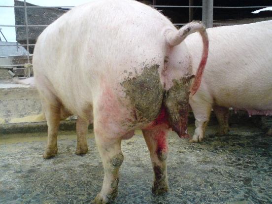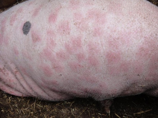 In the photo, the occurrence of erysipelas disease in a pig after vaccination.