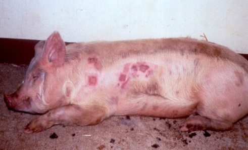 The photo shows what the septic form of erysipelas looks like in pigs in the initial stage.