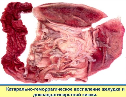 In the acute form, "bruises" appear on the skin around the neck, abdomen, chest and ears caused by subcutaneous hemorrhages. The spleen is slightly enlarged. The lymph nodes are juicy, with a red-blue tint, enlarged. The gastric mucosa is bright red, swollen, with punctate hemorrhages. May be covered with viscous mucus that is not easily washed off. In the small intestine, the changes are similar.