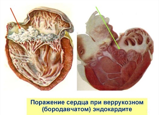 In the chronic form, black scabs form on the skin, which, after rejection, leave behind scars. At autopsy, bicuspid valve lesions are found in the heart. Less commonly, tricuspid, pulmonary, and aortic valves are affected. On the valves there is fibrin sprouted with a connective mass, which looks like a head of cauliflower.
