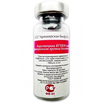 The vaccine is produced in 20 ml vials. Each vial contains 10 to 100 doses of dry vaccine. Before use, 10 ml of distilled water or saline is injected into the bottle. Sterile saline is easier to buy than water, so it's best to use the former. You can buy it in the same veterinary medicine as the vaccine.