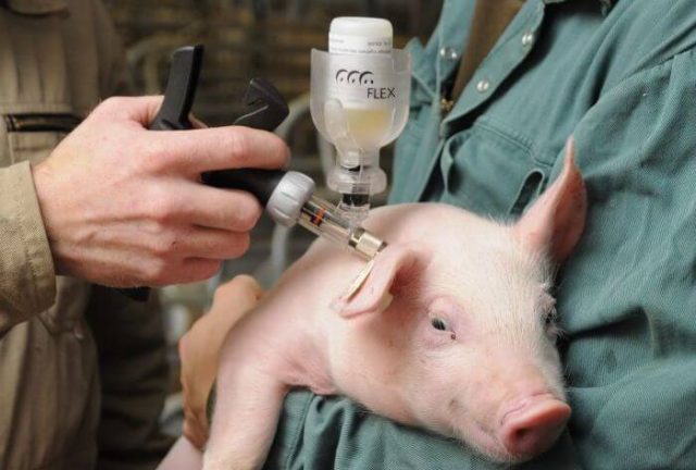 After adding saline, the vial is shaken vigorously until a suspension is obtained. The vaccine dose per animal is 1 ml. The vaccine is injected near the auricle or intramuscularly into the inner thigh. Vaccination of pigs against erysipelas is carried out according to several schemes, depending on the age of the vaccinated individual. Piglets begin to be vaccinated at 2 months, so that by the time they run out of passive immunity, the animals would have protection.