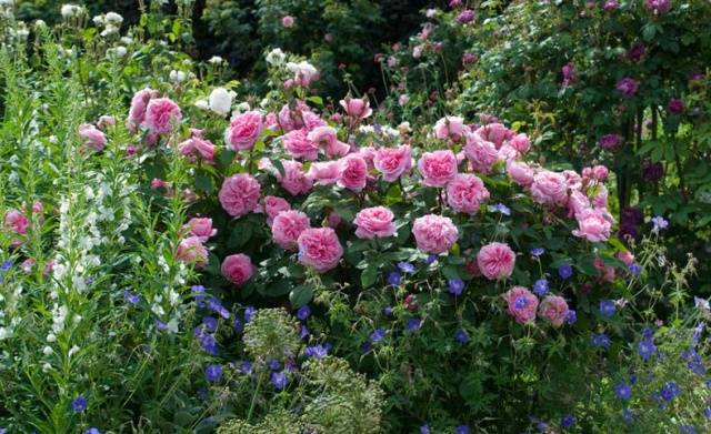Photo of Austin in a mixborder. Pink buds do not overwhelm the flowers surrounding the bush, on the contrary, they enhance their uniqueness.