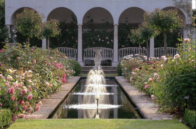 David Austin's English roses are a lush spherical bush. Landscape designers find them a variety of uses, planting them in the most secluded corners of a garden or park. The shape is created by pruning the rose bush.