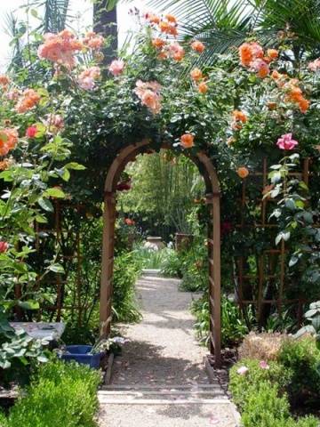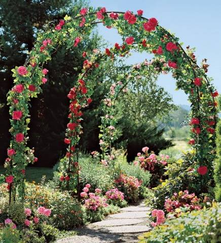 From curly ostins you can get amazingly beautiful arches and enfilades. You just need to find a place where they will compete favorably with other plantings of the garden, and make arched supports. They must be resilient. Rose bushes are planted under the supports. To prevent the whips from falling, gardeners wrap flexible branches around the base.