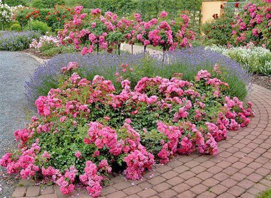 Carpets or ground cover varieties of roses when creating landscape design, they are planted both individually and in whole groups. Look at the photo how you can use such rose bushes when decorating a site.