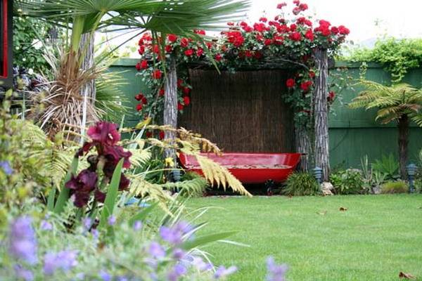 Luxurious places for rest and relaxation are one of the landscape design options. Climbing varieties of ostinks can be placed on wooden, metal trellises or made of thick wire, around garden benches, arbors.