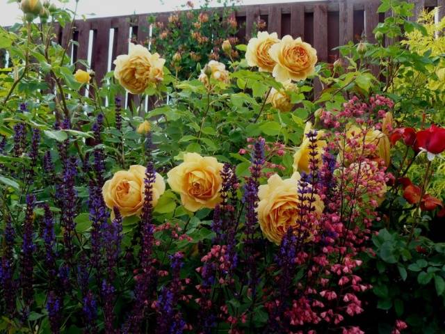 David Austin's English roses are good on their own, but in landscaping they are often combined with various garden plants. Such a neighborhood will not interfere with them, on the contrary, it will reveal the perfection of the queen of flowers to the fullest.