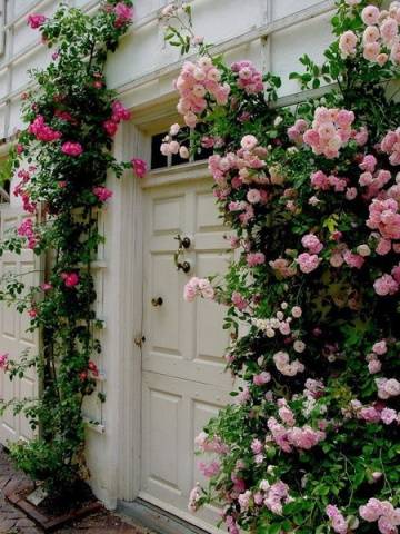 If the roses of David Austin are planted next to the house, then most often they choose a place near the front door or windows. The whips need to be positioned in a certain direction so that they can braid onto the supports. Flexible stems, the length of which is from 1.5 to 3 meters, are taken up along the supports around the window, they are even taken up to the roof of the house.