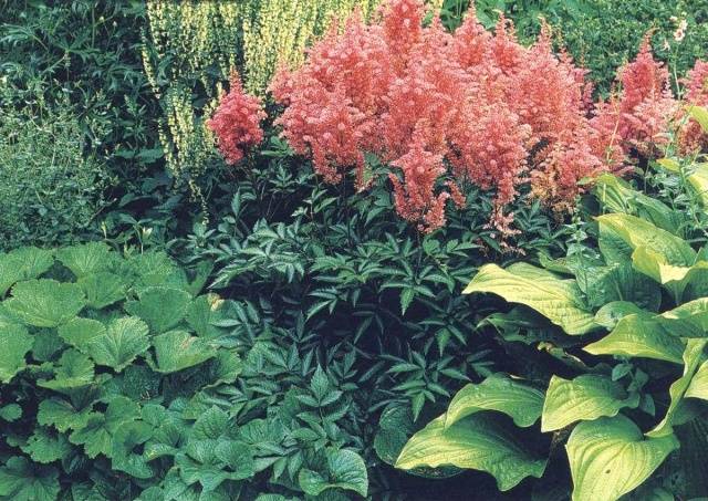 Deciduous plants go well with flowering plants, but you need to consider not only the color, but also the texture of the foliage and flowers.