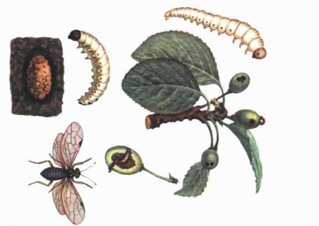 The black sawfly is a pest that looks like a yellow one, but has a black body and wings. Its larvae (about 30 individuals from 1 female) feed on plum pulp, damaging the bone as well. When the damaged fruit falls from the branch, the larva moves to the ground and pupates.