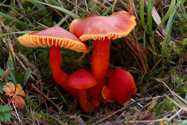 - Crimson - this representative belongs to the 4th group of edibility. The small fruiting body has a cone-shaped cap, which straightens as it grows. In adult specimens, the surface is spread, and the edges are transparent. In wet weather, the scarlet skin becomes covered with a mucous layer. The leg is thin and long. The hollow stem is red on top, becoming orange closer to the base. Prefers damp, open areas. Due to the lack of taste and smell, the species has no high nutritional value.