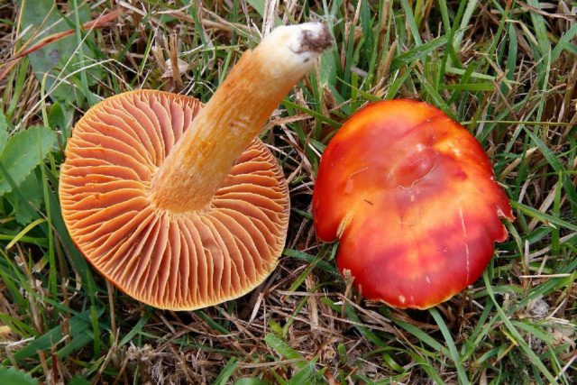 You should start your acquaintance with a view with external data. The cap in young bell-shaped specimens, as it ripens, partially straightens, leaving a slight rise in the center. The furrowed surface is slimy, bright red or orange in color.