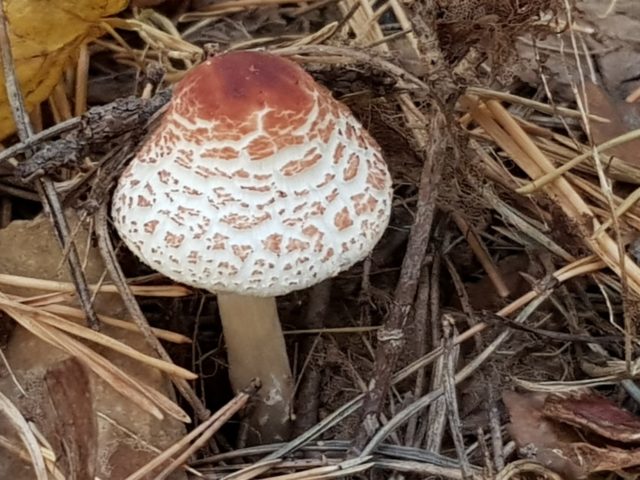 A blushing umbrella grows in open areas