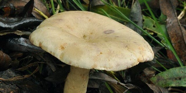 Another double - thyroid milky... Interestingly, when pressed, its plates also turn purple. But the specimen is distinguished by an ocher, yellowish surface and slightly smaller size. This is an inedible species and scientists do not recommend collecting it.