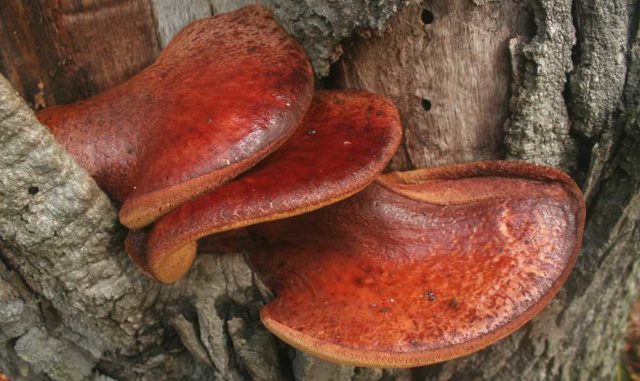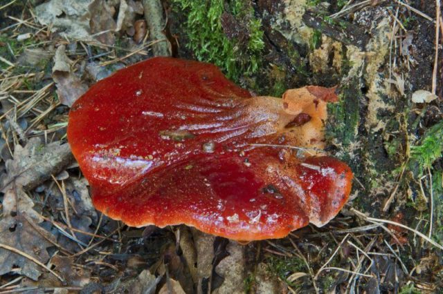 The liverwort mushroom can also be found under the names mother-in-law's tongue, common liverwort, hepatic tinder fungus and common liverwort. In the photo of an ordinary liverwort, it can be seen that the main part of the fungus is its cap, or fruiting body, it can reach up to 30 cm in diameter. In young fruit bodies, it is shapeless, but over time it acquires a fan-shaped or lingual shape. The color of the liverwort is bright red, dark purple or red-brown, the surface is shiny and smooth, slimy in wet weather. The underside of the cap is creamy or yellowish in color, with small short tubes, quickly turns red when touched.