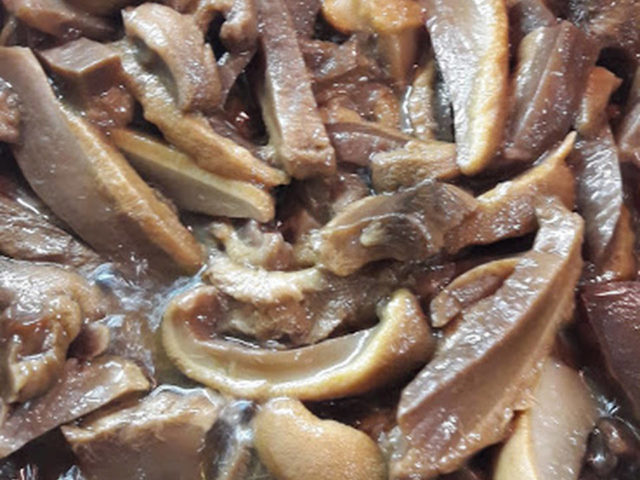 - 500 g of boiled liverworts and 200 g of fresh bacon are cut into large cubes;