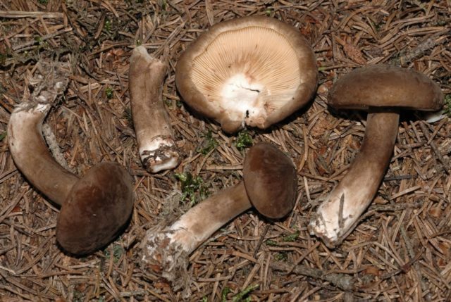 Resinous milky (black). A very rare mushroom. It differs from a zoneless one in a dark color, but at a young age it is lighter and may be similar to it. The cap reaches a diameter of 3 to 8 cm. Its shape is convex at first, then slightly depressed. The color is brown-brown, brown-chocolate, brown-black. The leg is dense, cylindrical, reaches 8 cm in height and 1.5 cm in thickness. The color is the same as that of the cap, at the base it is white. The pulp is light and firm. Grows in coniferous and mixed forests singly or in groups. The fruiting period is August-September. There is no exact information about edibility.