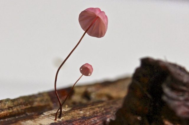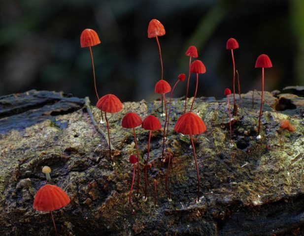 The blood-headed iris (Marasmius haematocephala) is a rare and therefore poorly studied species. This piece gets its name from the deep red domed hat. Outwardly, he seems disproportionate, since his cap is held on a very thin and long leg.