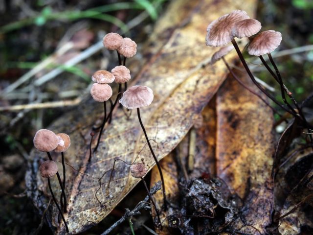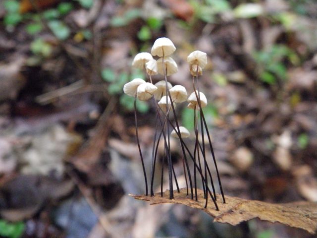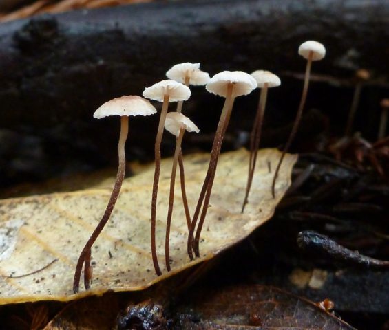 Garlic bristle-legged - a small lamellar mushroom on a thin stem.