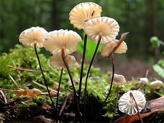Another similar species is the wheel-shaped nonnium. Refers to inedible, presumably not poisonous. It is small but somewhat large in size. The cap is from 0.5 to 1.5 cm in diameter, a very thin leg 8 cm high. It has a similar shape of the cap (first in the form of a hemisphere, then prostrate). At a young age it is completely white, in mature it is yellowish-grayish. The plates are adherent, but not to the stem, but to a small ring around it - the collarium. The pulp has a pungent odor. Occurs in areas with high humidity, grows in large groups. It settles on a litter of needles and leaves, on fallen trees.