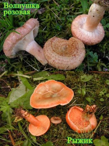 - Pink volnushka, or volnyanka, volzhanka, krasulya, broth. It is characterized by a convex cap with a diameter of 5 to 15 cm, which becomes flat with age with a small notch in the middle. Its color is pale or grayish-pink, on the surface of the skin of the fungus, a pattern of concentric circles ("waves") of a darker color is clearly visible, diverging from the center to curved down, slightly pubescent edges. The stem is pink, dense, cylindrical in shape, 3-7 cm long and up to 2 cm thick. The pulp of these mushrooms is white or light cream in color, with a faint coniferous odor. A pungent white juice appears abundantly at the fracture.