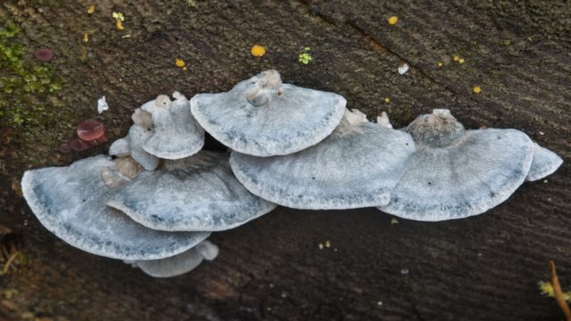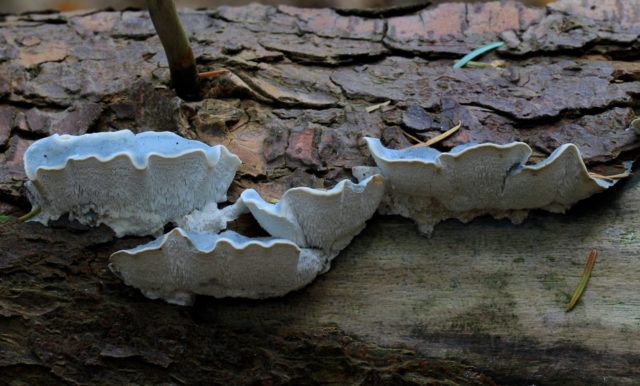 Posttia bluish-gray is an inedible mushroom with a rigid structure. The mushroom has a beautiful relief surface with a blue border and grows on conifers in the forest belt. It differs from other mushrooms in its unusual color and the presence of a small stalk.