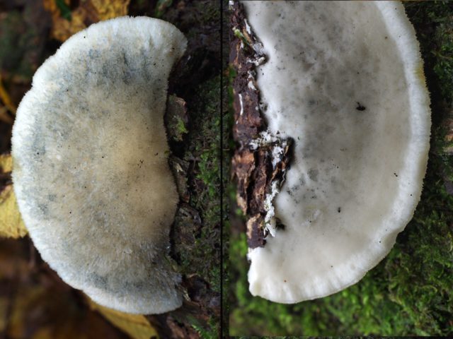 Postia bluish-gray - a mushroom with a stem, a half-cap, soft flesh and blue spots. The young mushroom has a lowered cap, older specimens are rounded. In color, it even approaches green and yellow.