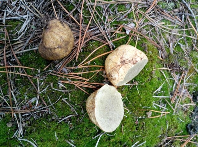 Another relative of the yellowish rhizopogon is the common rhizopogon (Rhizopogon vulgaris).Its fruiting body is shaped like a raw potato tuber up to 5 cm in diameter. It is partially or completely hidden in the ground. The skin of a young mushroom is velvety; in a mature one, it becomes smooth and slightly cracks. Grows in spruce and pine forests, sometimes found in deciduous. The harvesting season is from June to October. Never grows alone.