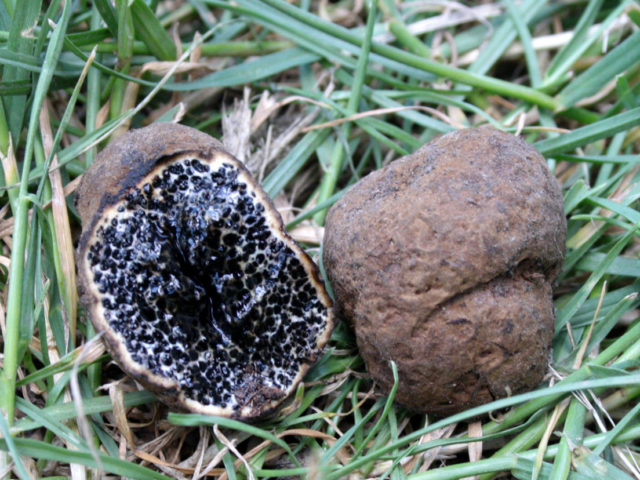 Rhizopogon yellowish resembles dubious melanogaster (Melanogaster ambiguus). It is a very rare edible mushroom that grows singly in deciduous forests from May to October. Young specimens have a brownish-grayish tomentose rough surface. In the process of growth, the surface of the fruiting body darkens, becoming almost black, becomes smooth. The pulp of the mushroom is purple-black, thick, fleshy, with a slight smell of garlic. Low taste.