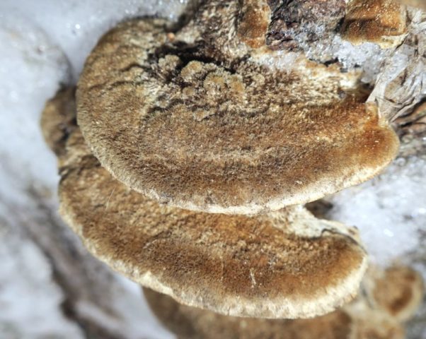 Gallic Coriolopsis. Inedible mushroom. The cap is pubescent, the spongy inner surface is dark-colored, the flesh is brown or brown.