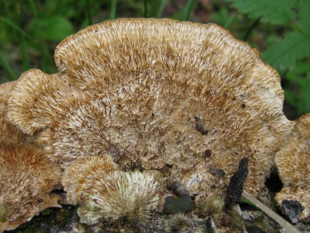The surface is dry, covered with thick, long cilia-bristles of golden color. The edge of young specimens is velvety, with a pile; in overgrown specimens, it is smooth, hard. Implicit concentric stripes, slightly embossed, diverge from the place of growth. The color is grayish-white, yellowish-olive and brown, brown-golden and slightly orange or rusty red. With age, the cap darkens, becoming a honey-tea color.