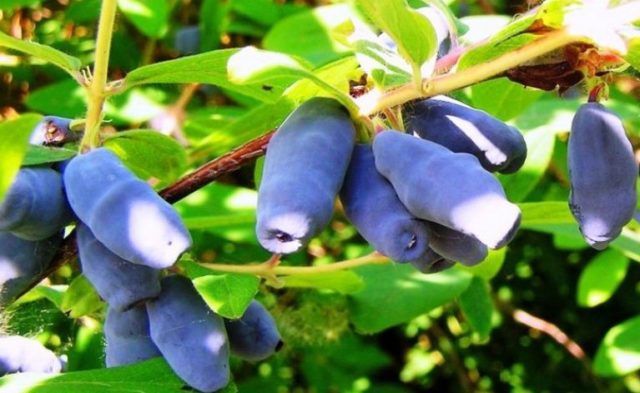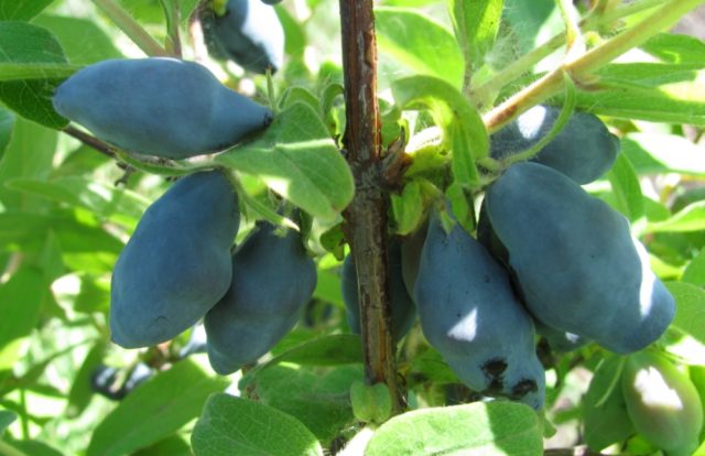Malvina's honeysuckle berries are large, average weight up to 1.1 g, length up to 30 mm, diameter 12 mm. Their surface is slightly tuberous, without pubescence. The shape of the berries is characteristic, with an uneven edge at the top.