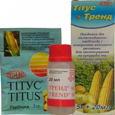 Titus Is one of the most popular potato herbicides used after germination. In its composition, the main active ingredient is rimsulfuron. It successfully destroys all annuals and climbing perennials. It does not pose any danger to potato seedlings, if you strictly follow the instructions for use, therefore it is recommended to process the potato field when the seedlings reach a height of 5 to 18 cm. It is advisable to carry out the procedure in dry weather.