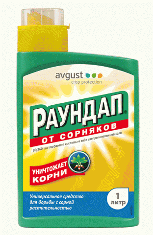 Roundup - the active substance is glyphosate. It is considered a low-toxic drug of continuous action. Destroys both aboveground and underground parts of any weeds. The results of its influence are manifested within 5-6 days after treatment. It is best to treat weeds with it in the active growing season.