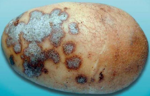 Rhizoctonia (black scab) | Dark spots appear on the tubers that look like bits of dirt. They rot during storage. Brown spots and sores are formed on the shoots and roots. | Seed potatoes are sprayed with the agrochemical Maxim, and before planting they are treated with Tecto, TMTD or Titusim. |