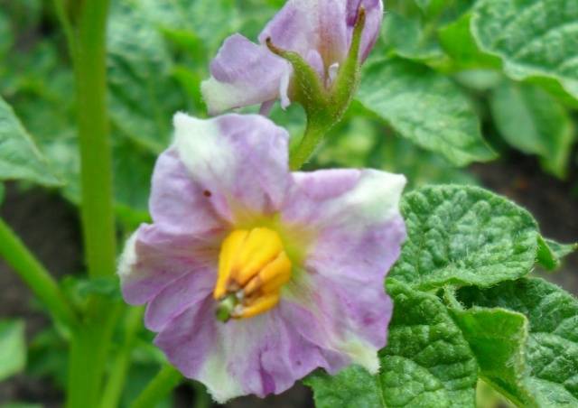 The potato bush is compact, medium in size, with semi-erect stems. The plant is covered with small green leaves. Inflorescences are lilac, with a reddish tint. Seedlings are uniform.