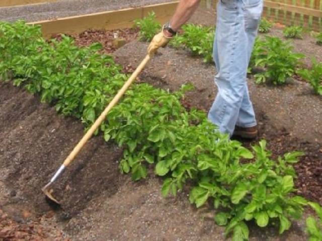 Weeding the ridges... A necessary event for potatoes. The first time the beds are weeded a week after planting.