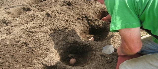 The minimum distance between nearby potato tubers is 30-35 cm. It is advisable to leave the row spacing more spacious - 70-75 cm. The depth of the planting pit depends on the quality of the soil. For heavy soil, 6-8 cm will be enough, but for loose and light soil, you need to dig a hole deeper, at least 12-15 cm.